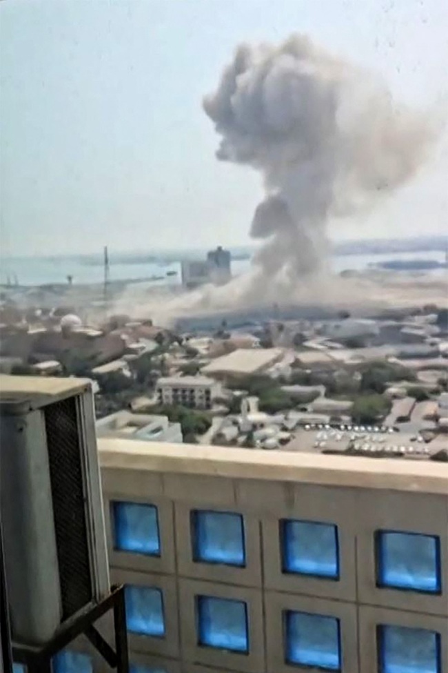 This video grab taken from UGC images posted on social media on February 28, 2026, and verified by AFPTV teams in Paris, shows a plume of smoke rising over Manama following several explosions in Bahrain’s capital. A centre for the US Fifth Fleet headquarters in Bahrain has been hit in a “missile attack”, Bahrain said on February 28, as Iran vowed retaliation following US and Israeli strikes. (Photo by various sources / AFP)