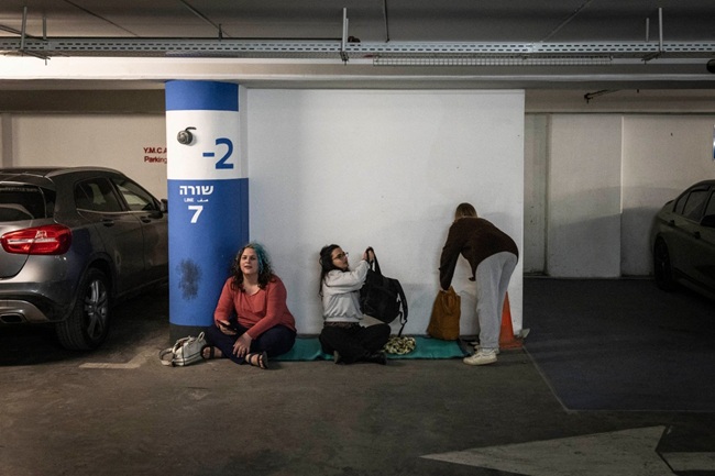 People take shelter in a underground parking as sirens sound in Jerusalem on February 28, 2026. The United States and Israel launched a wave of strikes against targets in Iranian cities on February 28, triggering explosions and columns of smoke in the capital Tehran. Iran responded by launching retaliatory missile attacks, according to the Israeli military, as US diplomats in the Gulf and Israeli civilians were ordered to seek shelter. (Photo by John WESSELS / AFP)
