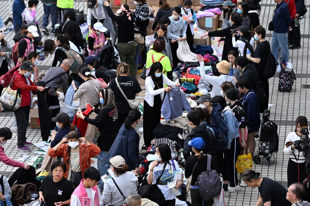 Volunteers distributed clothes and lunch boxes at the open-air podium of a nearby mall, while a few people gave out flyers with information about missing people.