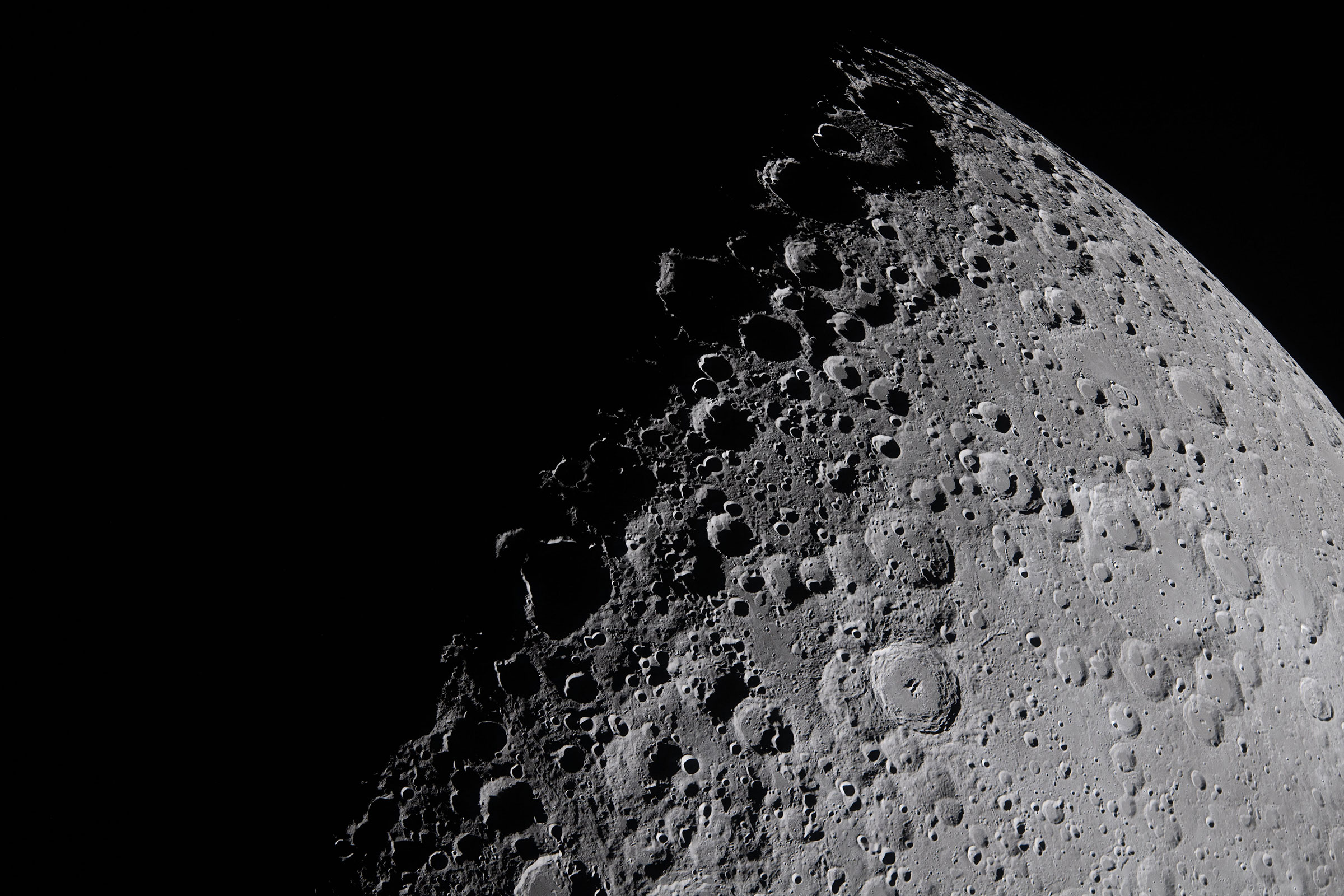 Three hours into their swing around the far side of the moon, the crew captured this striking, high-angle image. The terminator—the line that separates the light and dark sides of the moon—is visible at the top left. The sharp angle of the sun creates long, stark shadows that throw the rugged lunar terrain into relief. Shadows of this kind helped the Apollo crews read the landscape as they descended.