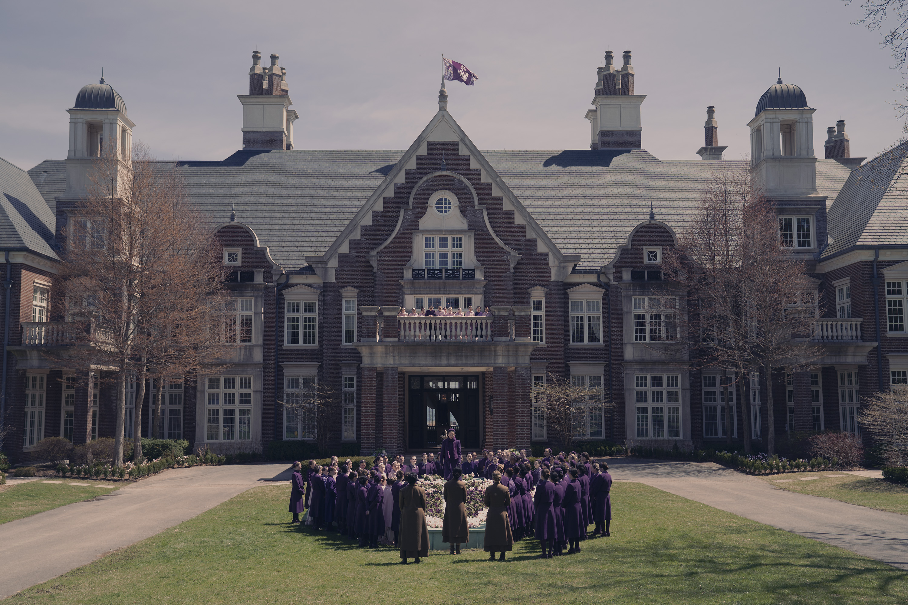 They inhabit a world that, on its surface, couldn’t be more different from the shadowy waking nightmares endured by Handmaids. Even though glancing at a member of the opposite sex can get a young woman slut-shamed, they manage to nurse crushes. Agnes moons over Garth (Brad Alexander), a Guardian with boy-band curls who is part of her family’s security detail but doesn’t rank high enough to merit a marriage match. Production design by Martha Sparrow echoes that of girlhood classics like Sofia Coppola’s Marie Antoinette; Bridgerton, another coming-of-age chronicle told through the marriage market, is another clear reference point. The Plums’ princessy bedrooms sprawl across whole wings. Sunbeams stream in through windows. Manicured gardens surround their houses and school. Interiors are decorated in frosting pastels. As one outsider puts it: “Gilead was so beautiful, sometimes I could forget where I was.”